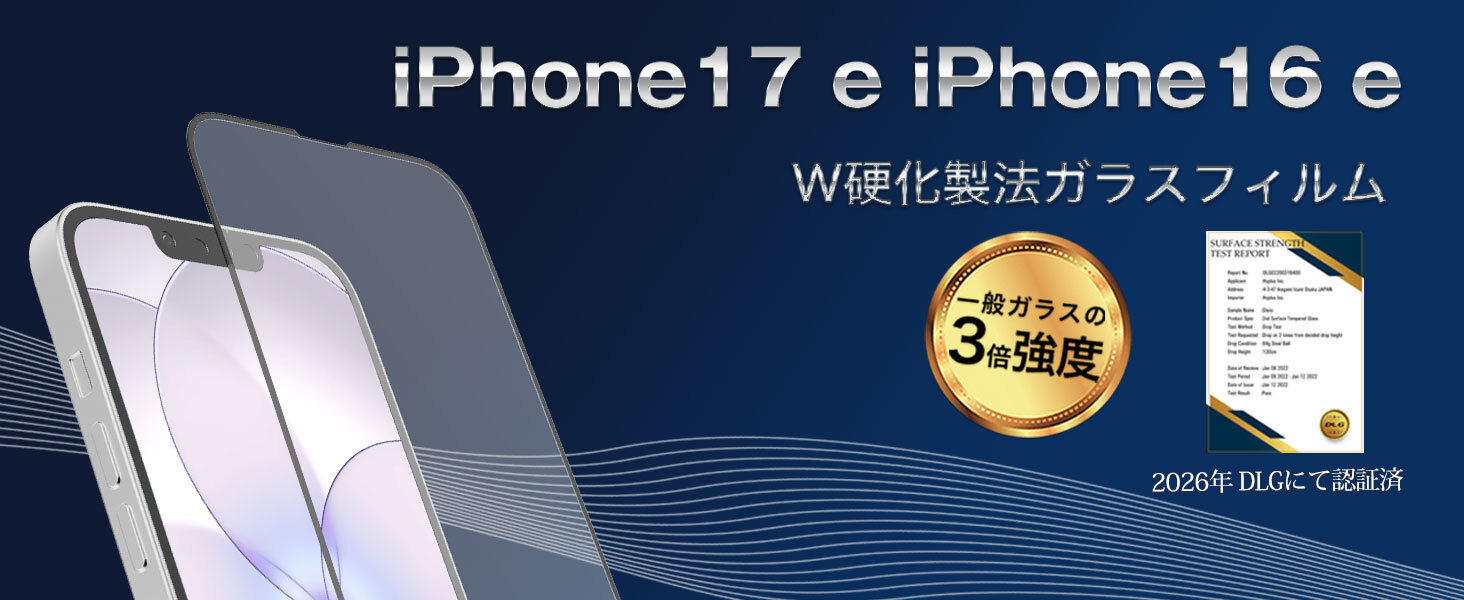 3倍強度!iPhone17 e iPhone16 e全面保護ガラスフィルム。W効果製法で強度をアップ!エッジ部分が丸みを帯びているラウンドカットタイプ。180日完全保証付き